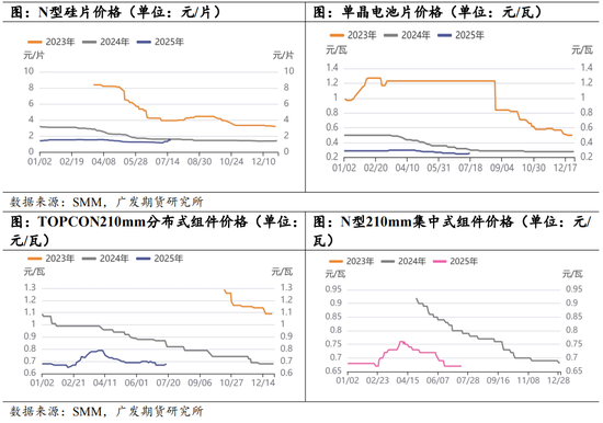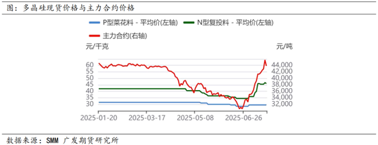 7月以来,多晶硅价格在“反内卷”政策预期下快速上涨。7月3日工业和信息化部组织召开的第十五次制造企业座谈会后,光伏产业企业快速响应同花易配,多晶硅现货报价快速上涨,期货盘面跟随现货报价上涨。现货N型复投料平均价从33元/千克上涨至46元/千克,涨幅约30%。期货主力合约也跟随大幅上涨,从33090元/吨上涨至49105元/吨,涨幅约48%。